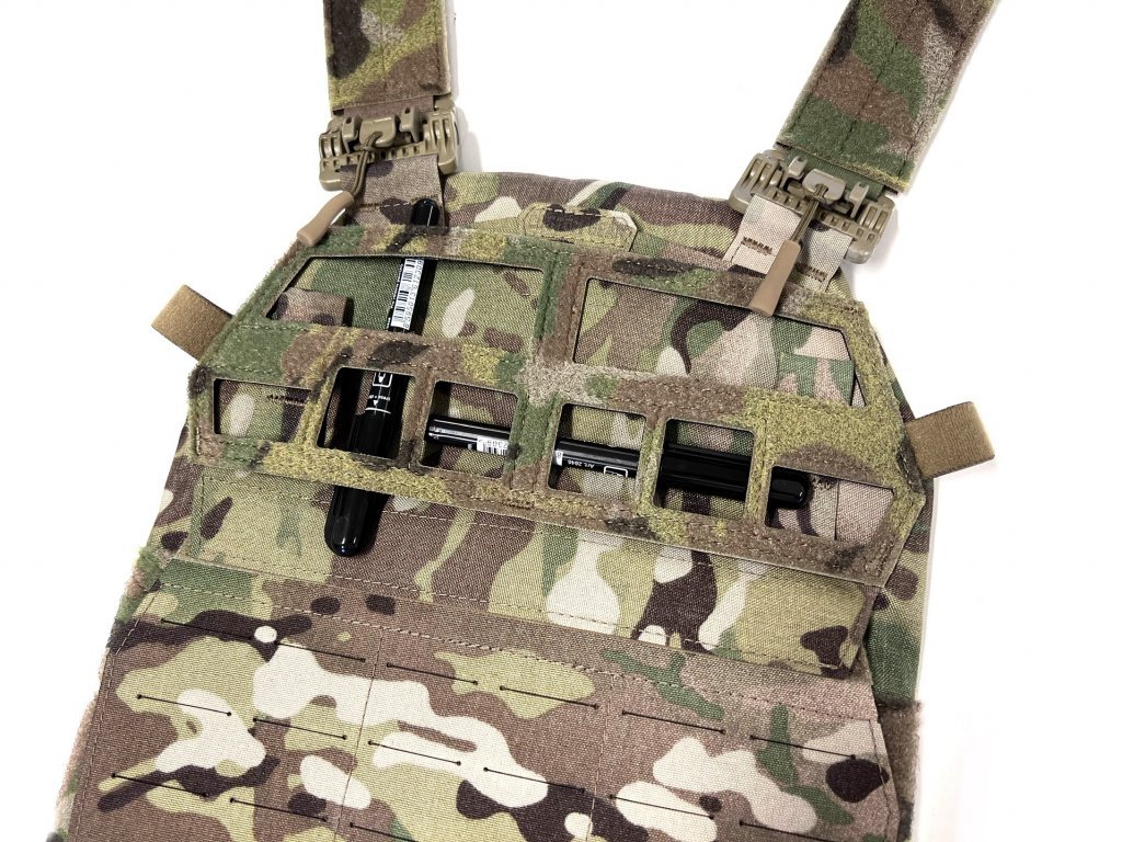 Pro sekundární pojištění zádového panelu, jsou v horní části zadního dílu čtyři otevřené otvory pro maximální rychlost a pohodlnost při provlékání úchytů s druky od zádového panelu. Třetím pojistným bodem, je také nově přidaný zádový VELCRO panel pro uchycení ID patchů, který slouží i fixaci zádového panelu, pokud je ze zadní strany opatřený hrubou částí VELCRO suchého zipu. Tyto protikusy již nově naše panely poskytují.